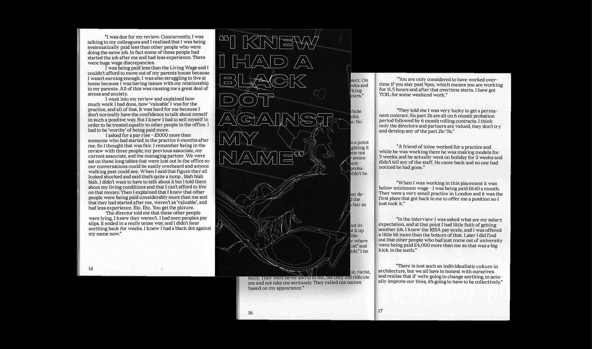 In 2018 I collaborated with Architectural workers in order to design this cheap, repeatable publication which records the experiences of workers in the architectural industry. The zine was designed to act as a platform for workers to collectively share their personal experiences of exploitation in industry in order to empower one another. It was disseminated during the Architectural Workers event, Workers Enquiry, What are our Demands For (Change) in Architectural Work? The zine is aesthetically reminiscent architectural offices and blueprints, visualising the dark, alienating experience of Architectural work, whilst containing statistics, experiences and tools for the empowerment of the workers in the fight against exploitation and social cleansing.