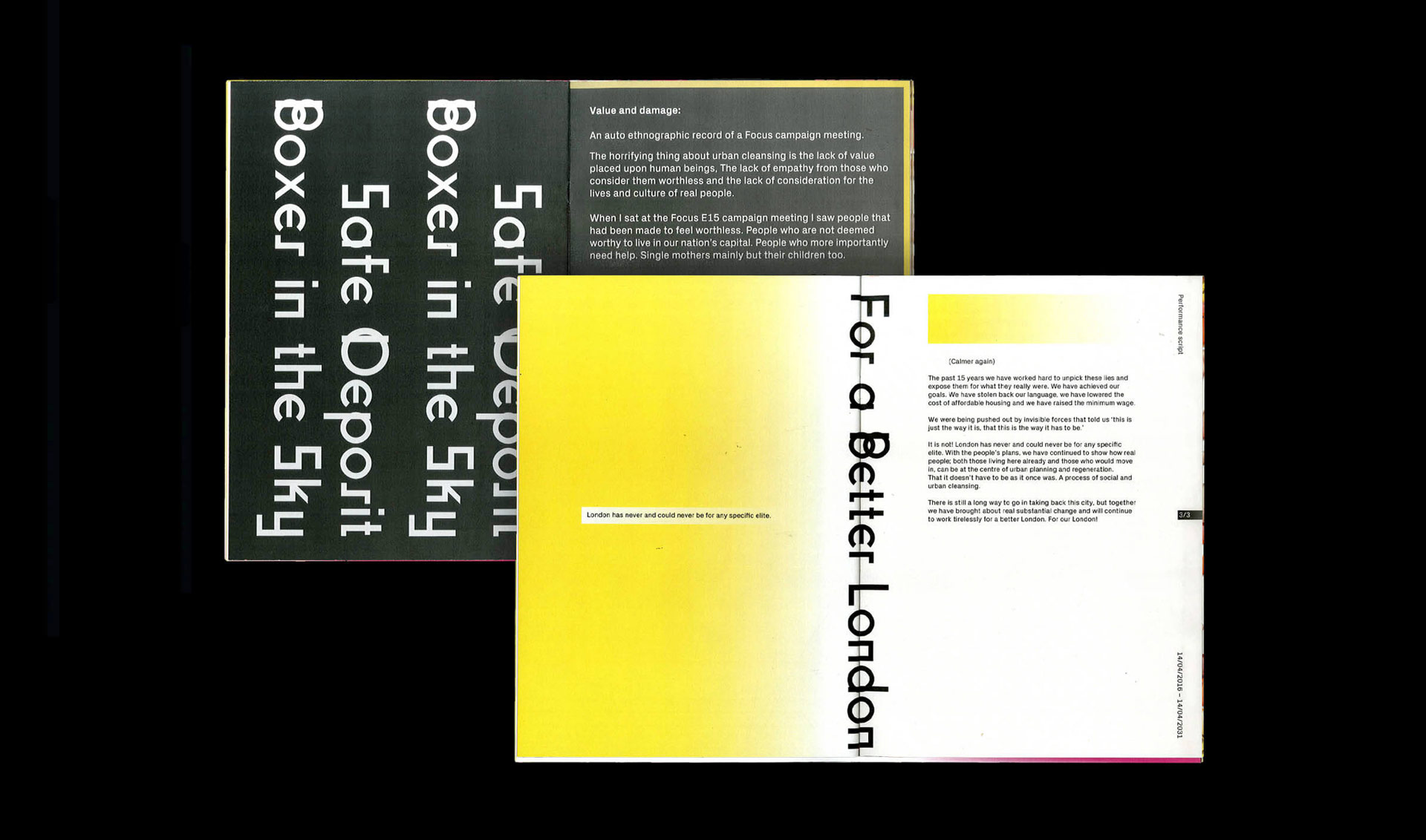 Produced as part of a three month research project for the RDP (Research, Design, Publish) elective at the Royal College of Art in 2016. For the duration of the three months I worked alongside housing campaigns such as Save Cressingham Gardens and Focus E15 on campaign materials. The research I gathered during this three month period culminated in a publication and live performance as part of the RDP 2016 Exhibition.