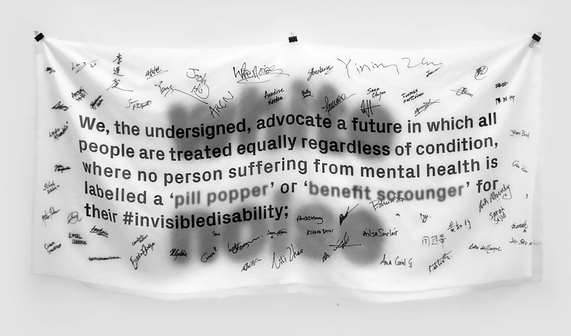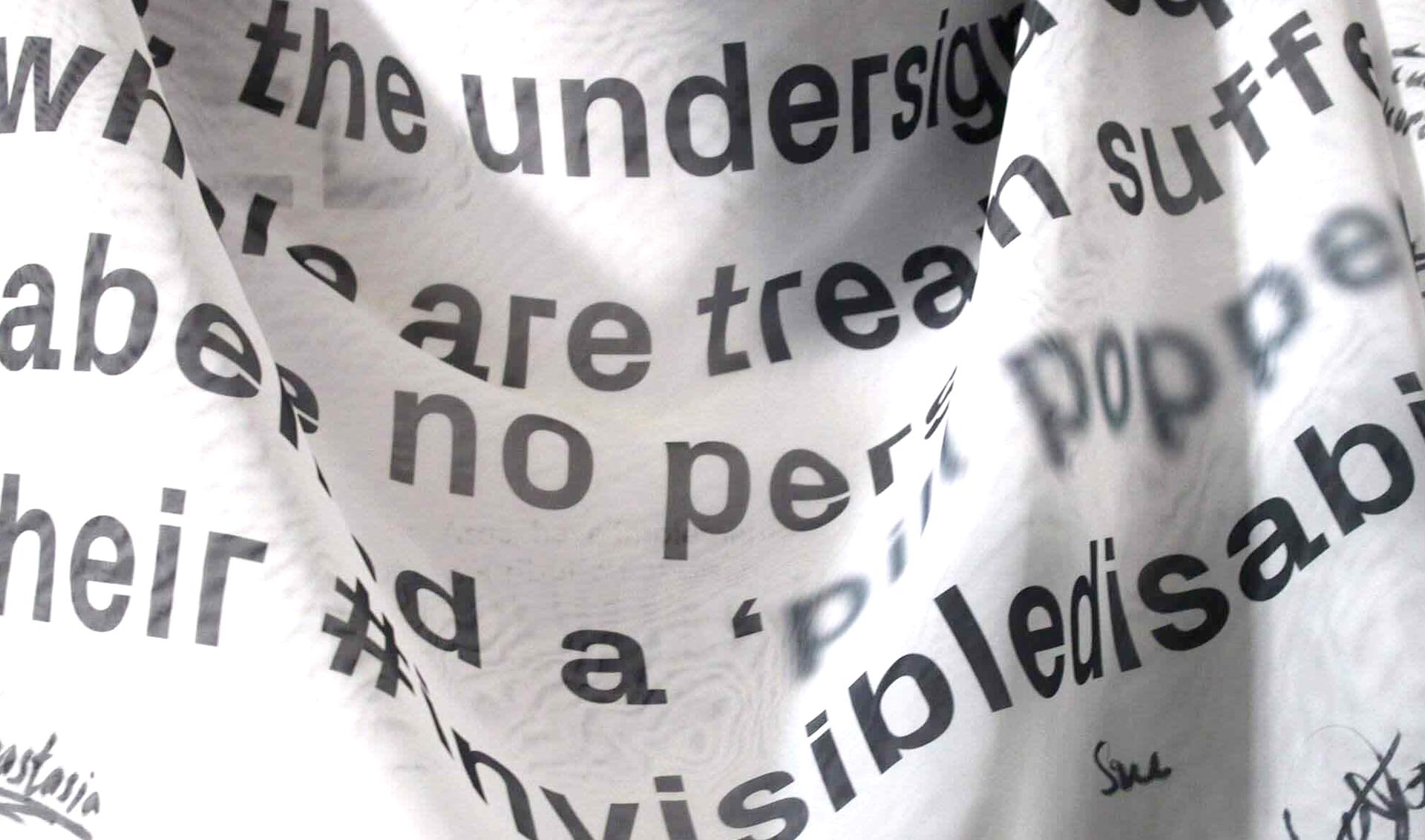All print material embrace ideas of fading visibility through utilising semi transparent materials. The petition banner spoke out against the stigmatisation of mental health and called for solidarity in support of this suffering from mental health and government cuts.
